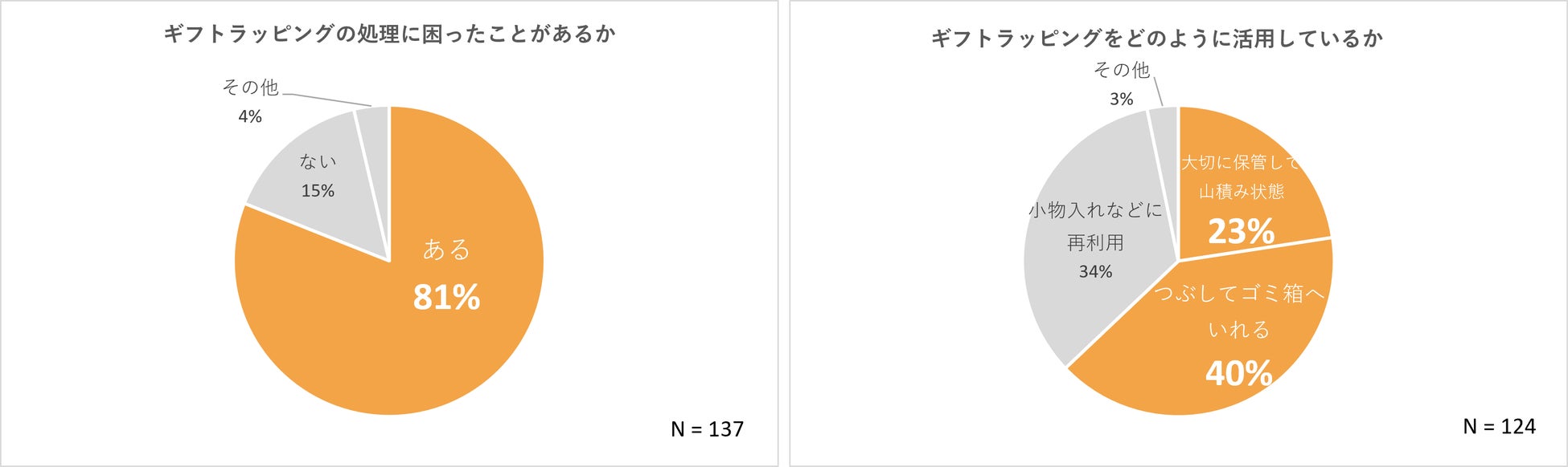 本調査では、まず、どれだけの人がクリスマスプレゼントを贈るのかという点を明らかにするため、「今年クリスマスプレゼントを誰かに贈る予定があるか」という質問を実施しました。半数以上の76%の人が「ある」と回答。多くの人がこの時期ギフトを贈ったり贈られたりしていることが分かりました。では、そのギフトに欠かすことのできないラッピングやボックスは、贈られた後どのようにされているのでしょうか。「ギフトラッピングの処理に困ったことがあるか」という質問に対し、80%以上の方が「ある」と回答。さらに、「ギフトラッピングをどのように活用しているか」という質問に対し「大切に保管して山積み状態」が23%、「つぶしてゴミ箱へいれる」と回答した人が40%という結果になりました。この調査から、ギフトを贈ったり贈られたりすることは多くあっても、貰ったギフトのラッピングをうまく活用できていない人が大半であることが明らかになりました。