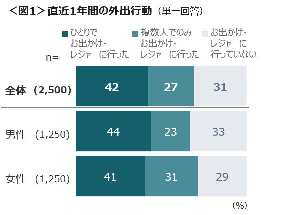 提示した28ジャンルのお出かけ・レジャー先のなかで、この1年間にお出かけ・レジャーに行った人は69%、ひとりで行った経験のある人は42%であった。<図1>