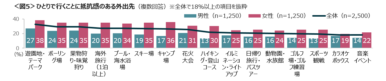 「遊園地・テーマパーク」「ボーリング場」「果物狩り・味覚狩り」「海外旅行」「プール・海水浴場」「スキー場」などが”ひとりで出かける”には抵抗感がある場所としてあがった。女性はどのお出かけ先でもひとりで行くことへの抵抗感が高い。<図5>