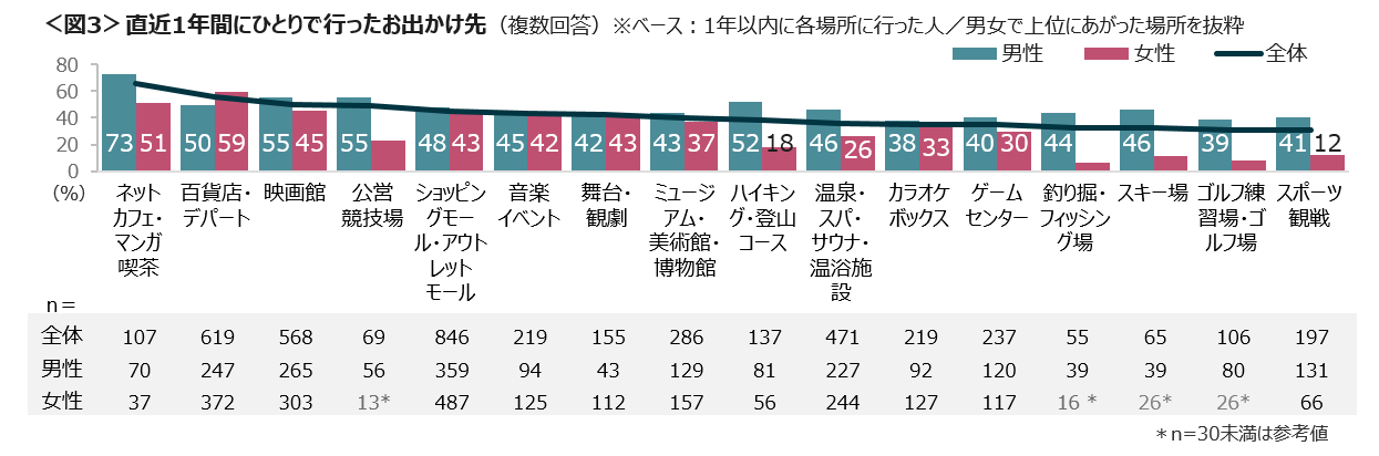 各お出かけ先に行った経験のある人に、ひとりで出かけた割合を確認した。男性は「ネットカフェ・マンガ喫茶」「公営競技場」「映画館」「ハイキング・登山コース」「百貨店・デパート」で5割以上、それ以外のお出かけ先でも”ひとりで出かけた”割合が高い。一方、女性で5割を超えるのは「百貨店・デパート」「ネットカフェ・マンガ喫茶」。男性より女性で”ひとりで出かけた”割合が高いのは「デパート・百貨店」であった。<図3>