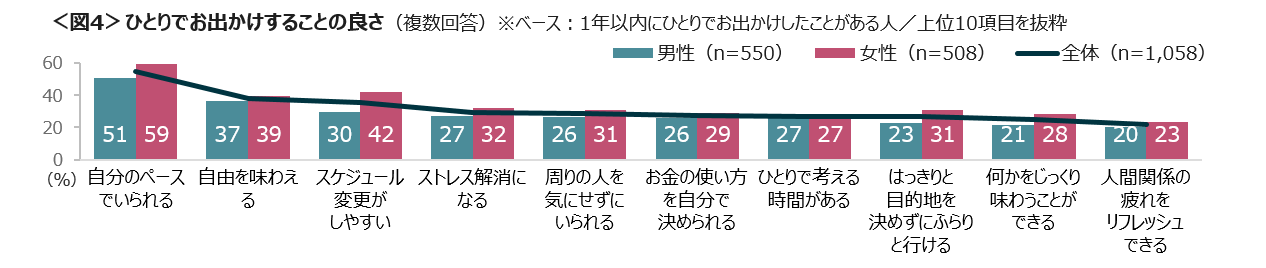 この1年間で”ひとりで出かけた”経験者に良さを聴いたところ、「自分のペースでいられる」が最も多く、次いで「自由を味わえる」「スケジュール変更がしやすい」「ストレス解消になる」であった。「自分のペースでいられる」「スケジュール変更がしやすい」は、女性において実感している人が多い。<図4>