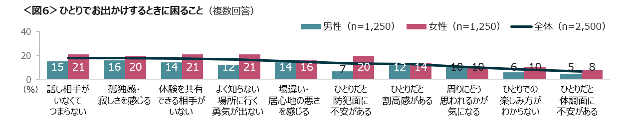ひとりでお出かけするときに困ることは「話し相手がいなくてつまらない」「孤独感・寂しさを感じる」「体験を共有できる相手がいない」などであり、特に女性では「防犯面に不安がある」人が目立った。<図6>