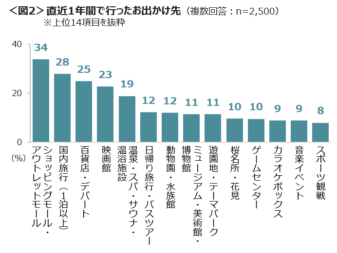 複数人との行動も含むお出かけ先は、「ショッピングモール・アウトレットモール」「一泊以上の国内旅行」「百貨店・デパート」「映画館」「温泉・スパ・サウナ・温浴施設」が上位であった。<図2>