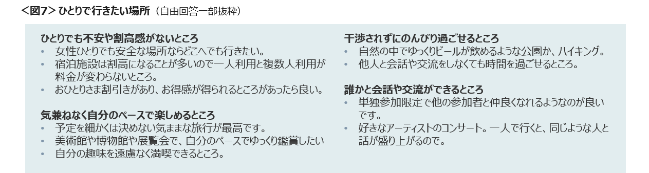 ひとりでお出かけやレジャーに行くとしたら、どのようなところが良いか聴取した。女性なので安全な場所やひとり利用と複数人利用で料金差のないところなど「ひとりでも不安や割高に感じないところ」、趣味を満喫できる「気兼ねなく自分のペースで楽しめるところ」、「干渉されずにのんびり過ごせるところ」、「ひとりでも誰かと会話や交流ができるところ」が良いという声があがった。<図7>
