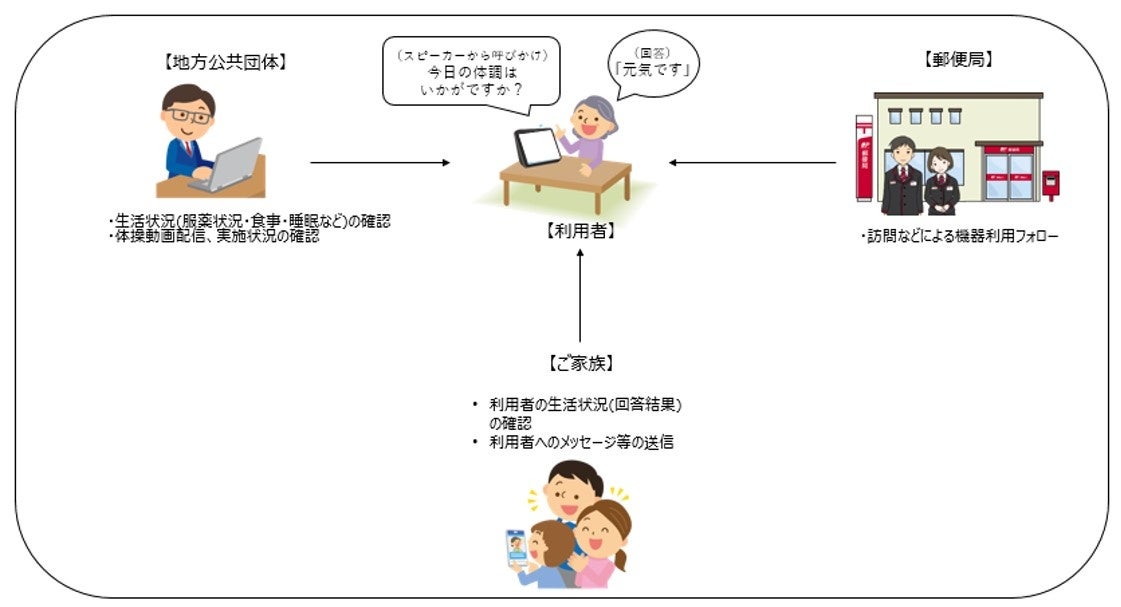 スマートスピーカーを活用した見守りアプリケーション(高齢者の生活状況の確認、確認結果の家族などへの通知、家族や米子市などから高齢者へのお知らせの発信、体操動画の配信などが可能)を提供するほか、郵便局社員によるスマートスピーカーの使用方法に関するフォローなどを行います。