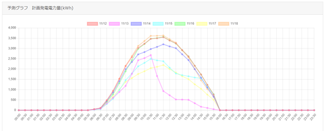 · 発電量予測に加えて、過去の気象データ、最高気温、最低気温、日照時間、全天日射量などの情報も併せて提供。さらに最新の予報から 7 日分のデータが比較できる機能を実装し、需給管理者の JEPX の翌日スポット市場の計画値策定業務を強力にサポート。