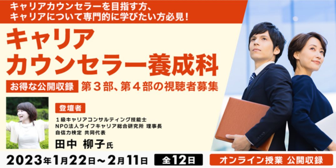 今回の公開収録では、12月から1月にかけて行った第1部「キャリアカウンセリングの社会的意義」と第2部「キャリアカウンセリング知識」に続き、第3部「メンタルヘルスの知識」(全4日間)と第4部「キャリアカウンセリングの基本的な技能」(全8日間)の視聴者を募集。正規に受講されるよりも断然お得な価格(5,500円[税込])でご視聴いただけます。キャリアカウンセラーをめざす方やキャリアについて専門的に学びたい方は、この機会にぜひお申し込みください。また、キャリアコンサルタントの国家試験にむけて学習している方の復習用教材としてもおすすめの内容です。
