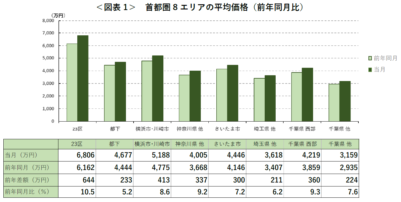 首都圏8エリアの平均価格は、13カ月連続して全エリアで前年同月超えとなった。中でも、東京23区の前年同月比は11カ月連続で10%を超えている。