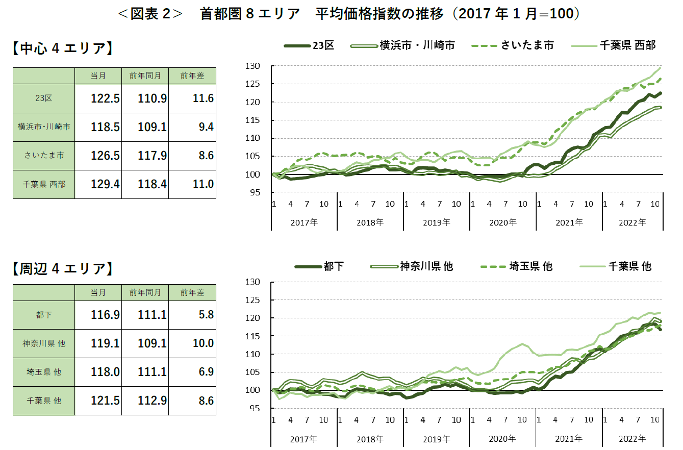 前月比では、東京都下、神奈川県他が下落したものの、さいたま市、千葉県西部では1%以上の上昇となっており、中心エリアの上昇率はいずれも周辺エリアを上回った。