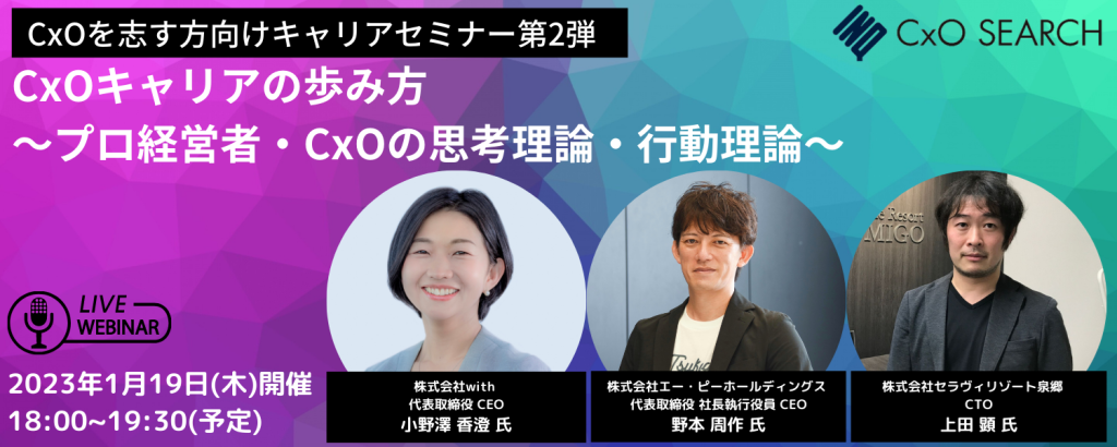 経営者やCxOキャリアの魅力ややりがいを感じていただくとともに、現在の仕事や今後のキャリア選択の参考になればと思っております。奮ってご参加ください。