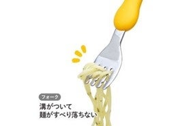 フォークは麺が滑り落ちにくい独自の溝を採用。スプーンは平らな先端がカップやお皿の底にフィットするので最後までキレイにすくえます。