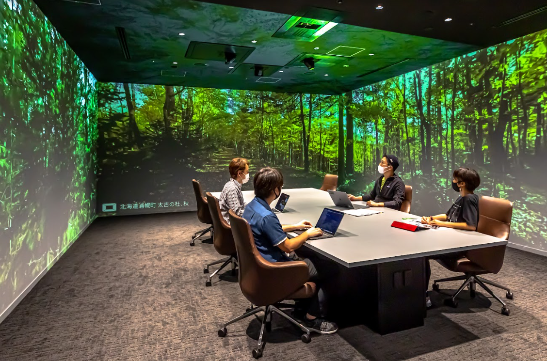 プロジェクターと専用PCを設置するだけで、いつものオフィスが絶景自然空間へと変わります。