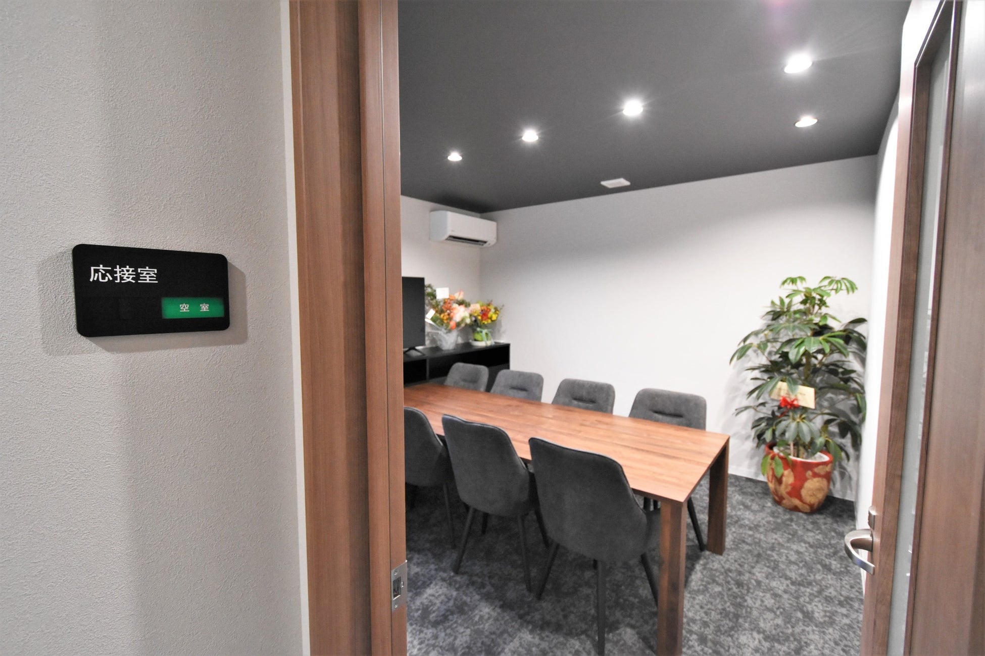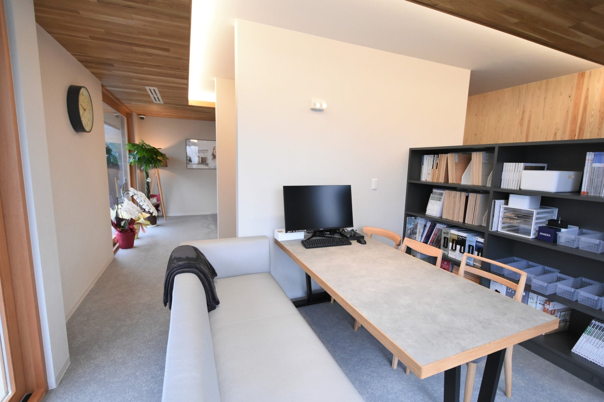 移転した香川支店は、CLTの木をそのまま見せる現わし仕上げや、天井・軒天の板張り、木製サッシなどにより、木の素材感やぬくもりを感じる明るい空間としました。平屋建てとした香川支店には、ゆったりとした打合せスペース、サンプルやカタログの展示スペース、応接室などを設け、また、今後のスタッフ増員に備え、オフィススペースも広く確保しました。