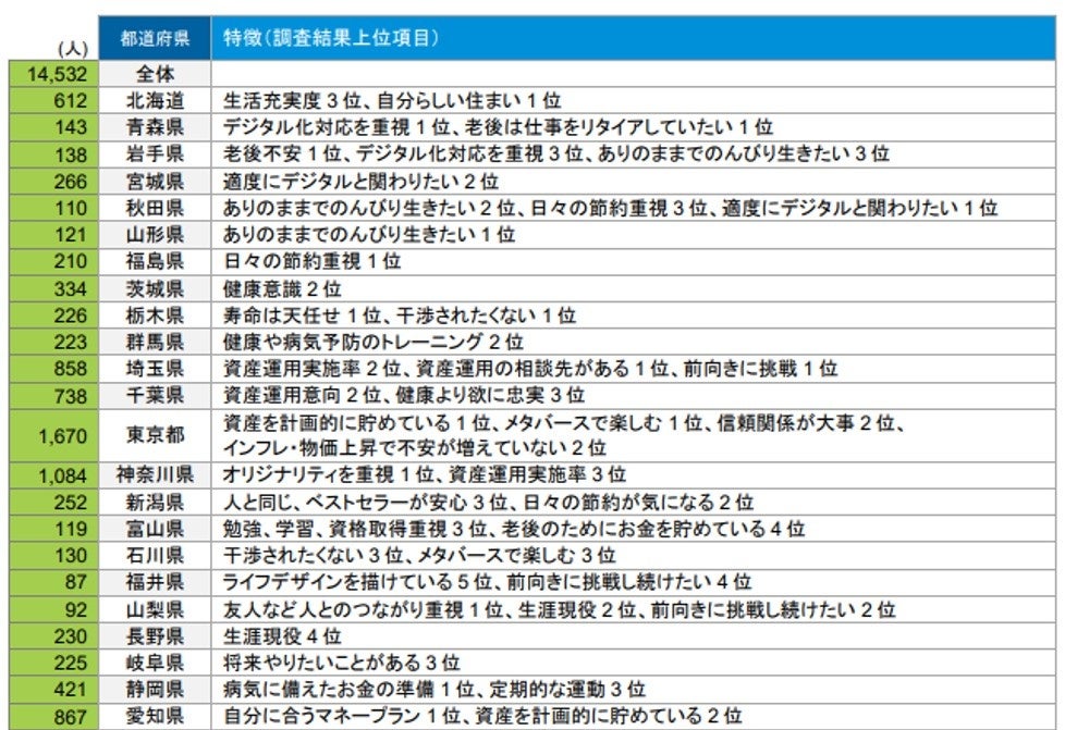 全国47都道府県のそれぞれの特徴が優劣でなく“違い”として表れ、ライフデザインやお金に対する向き合い方も興味深い。