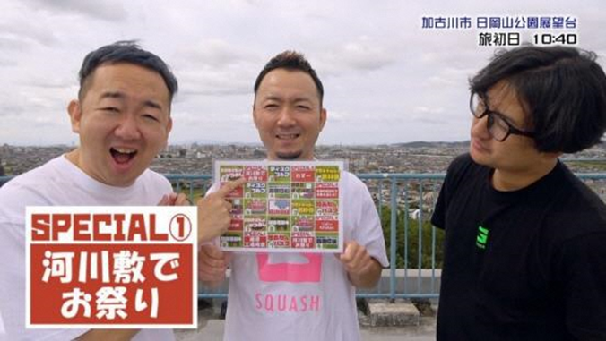 「劇団スカッシュ」メンバーのうち3人が、加古川市の名物を体験して36時間以内にBINGO達成を目指す動画「BINGOの旅in加古川市」を撮影し、その動画を2022年11月25日(金)から5週連続で公開する企画です。達成を目指すビンゴのマス目は、8種類の加古川名物と6種類のスペシャルチャレンジで構成されています。8種類の加古川名物には、「かつめし」、「加古川和牛」といったグルメから、特産品の「靴下」、美しい景色が楽しめる「高御位山」など、加古川が誇る魅力的な名物、スポットがピックアップされています。少しマニアックなスペシャルチャレンジには加古川の河川敷でのイベント参加や、カヌー体験、加古川ご当地グルメ鍋「恵幸川鍋」作りなどの魅力的な体験を織り交ぜています。