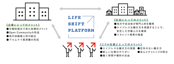 ・「ライフシフトプラットフォーム」概要:「人生100年時代」、さまざまな専門性を有するビジネスパーソンが、年齢を理由に活躍を制限されることなく、自律したプロフェッショナルとして中長期的に価値を発揮しつづけることができるようサポートする基盤。