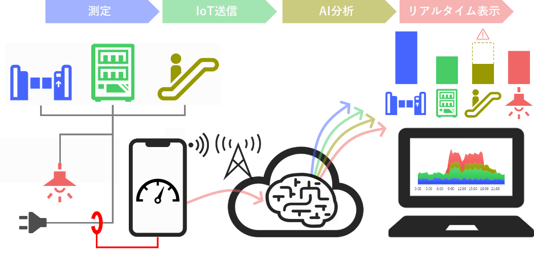 今回の取り組みでは、2022年12月12日(月)から、相鉄線の駅やスーパーマーケット「そうてつローゼン」の店舗(予定)で、廃棄スマートフォンをリユースした「AI・IoTを活用したスマート電流計(以下、スマート電流計)」を使い、消費電力の遠隔監視を行っています。電力使用量の内訳をリアルタイムで取得し、駅や店舗の利用状況から乗降人数・来店人数あたりの電力消費量などの「電力の見える化」とそれに伴う「CO2排出量の見える化」が可能となります。ここで得たデータを脱炭素へ向けたアクションプラン策定などの基礎資料として活用することで、脱炭素化への具体的な取り組みにつなげます。