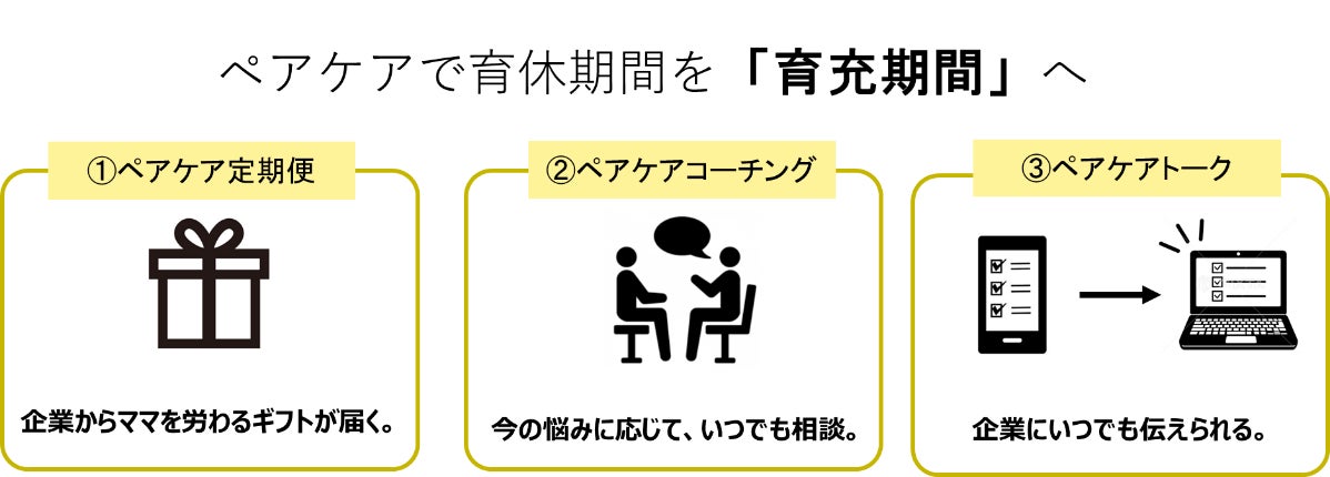 当社は、当社のサービス「ペアケア」を通じて、企業の福利厚生の一環として、育休期間中の従業員に対し様々なサービスを提供しています。育休取得者に聞いた「こんなサービスが欲しかった」「これがあれば嬉しかった」といった声から生まれたサービスで、企業との繋がりが希薄になる育休期間中の企業と従業員のコミュニケーションをより円滑に、質の高いものにすることで、スムーズな復職やキャリアに対して納得感のある選択をするためのサポートを目的としています。