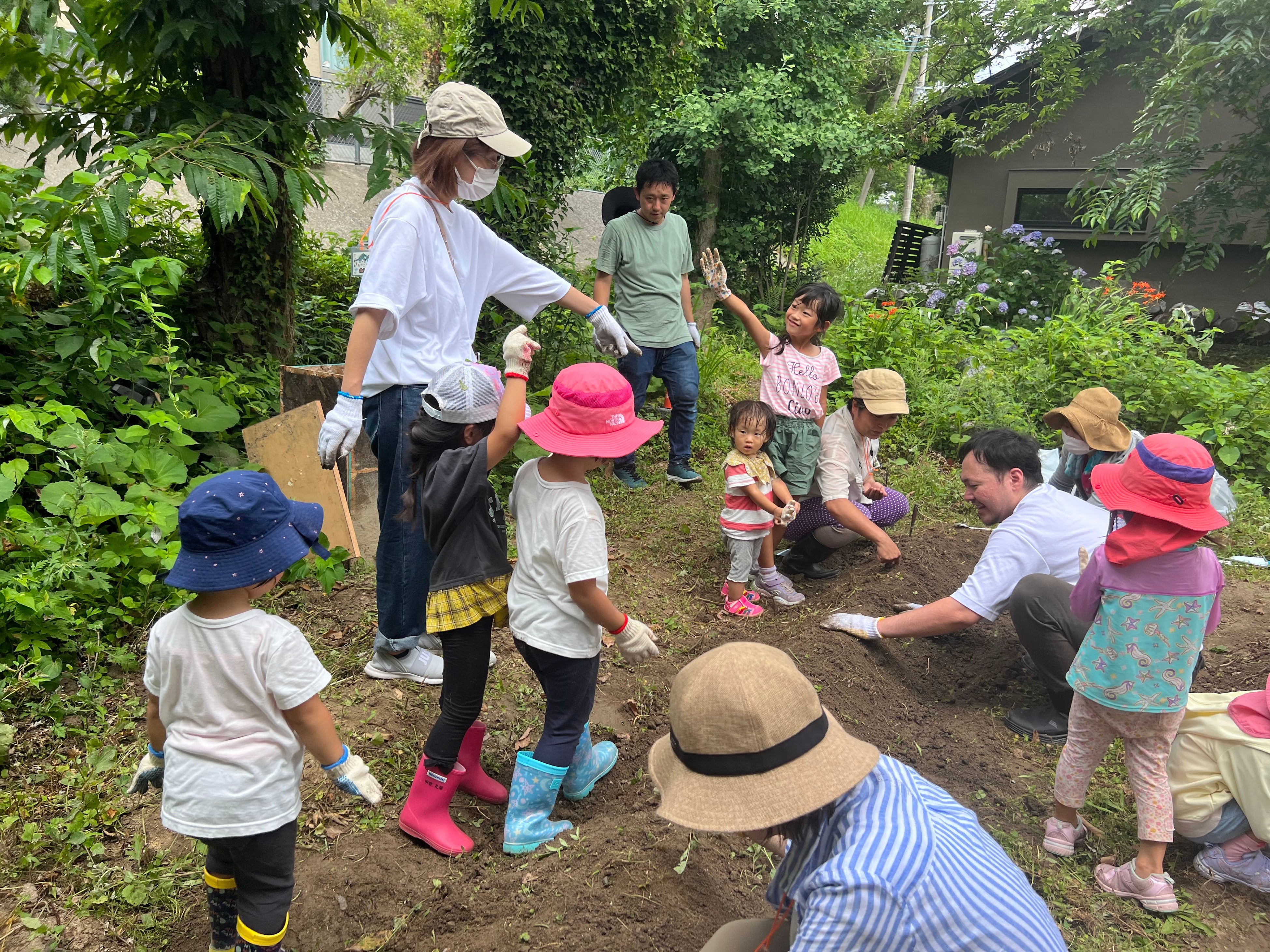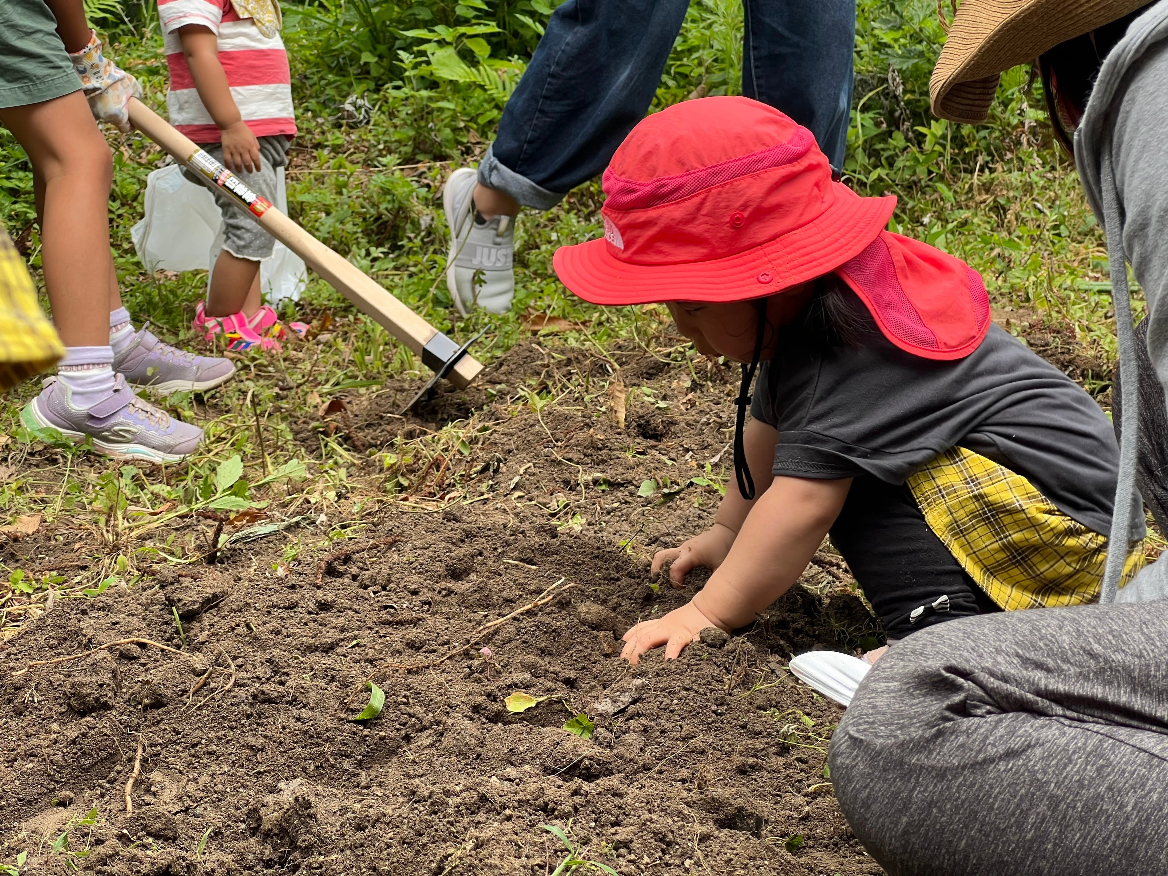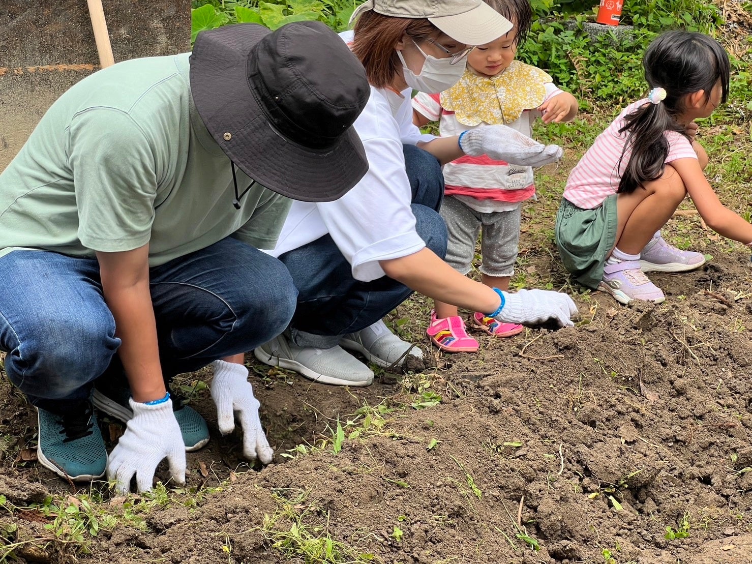 土を耕し、野菜を育てる過程には、見る、聞く、匂う、触る、味わう体験が満載です。畑の周りには名前を知らない野草や花が咲きます。バッタやカマキリが潜んでいます。街中の公園では気づかなかった土の匂い、風の音、日差しの温度の変化を感じることができます。まずはオヤ=大人が五感をフル発揮して畑での活動を楽しんでほしいです。そんな親たちの姿を吸収して、子どもたちが健やかに育っていきます。