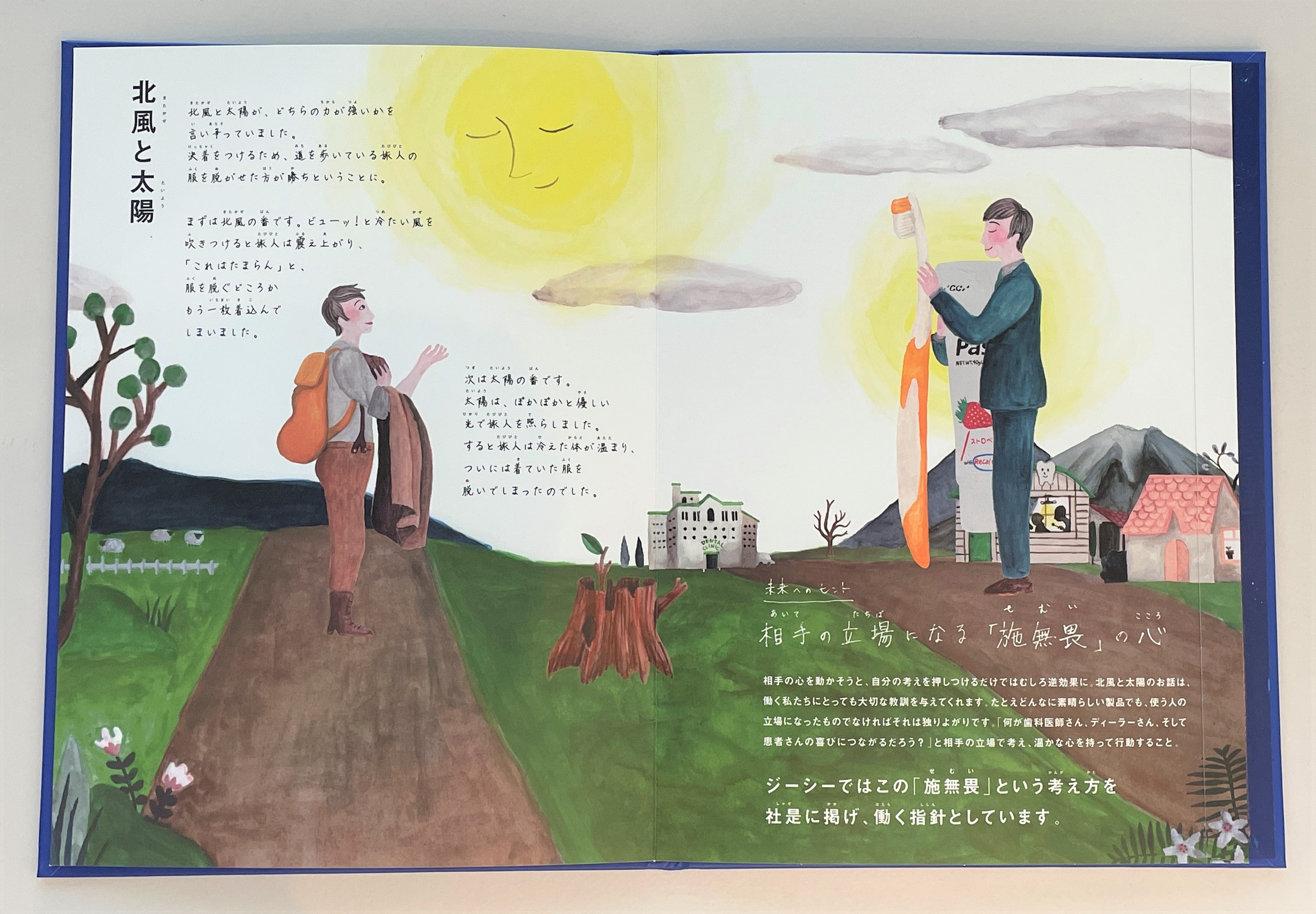 同誌は、絵本のようなデザインで、誰もが知っている「北風と太陽」などの童話をモチーフに、童話の教えとジーシーの「大切にしてきたこと」を重ね合わせ短い文章で表現し、裏面(デジタル版後半)では、各事業所を世界遺産などを交えイラストで表現しています。また同誌は、ジーシーのネットワークを通じて日本の歯科医院の約半数に送られ、更に社員自身がジーシーに勤めていることを家族などに誇れるように社員にも配布してエンゲージメントを高めるツールとしても活用しています。
