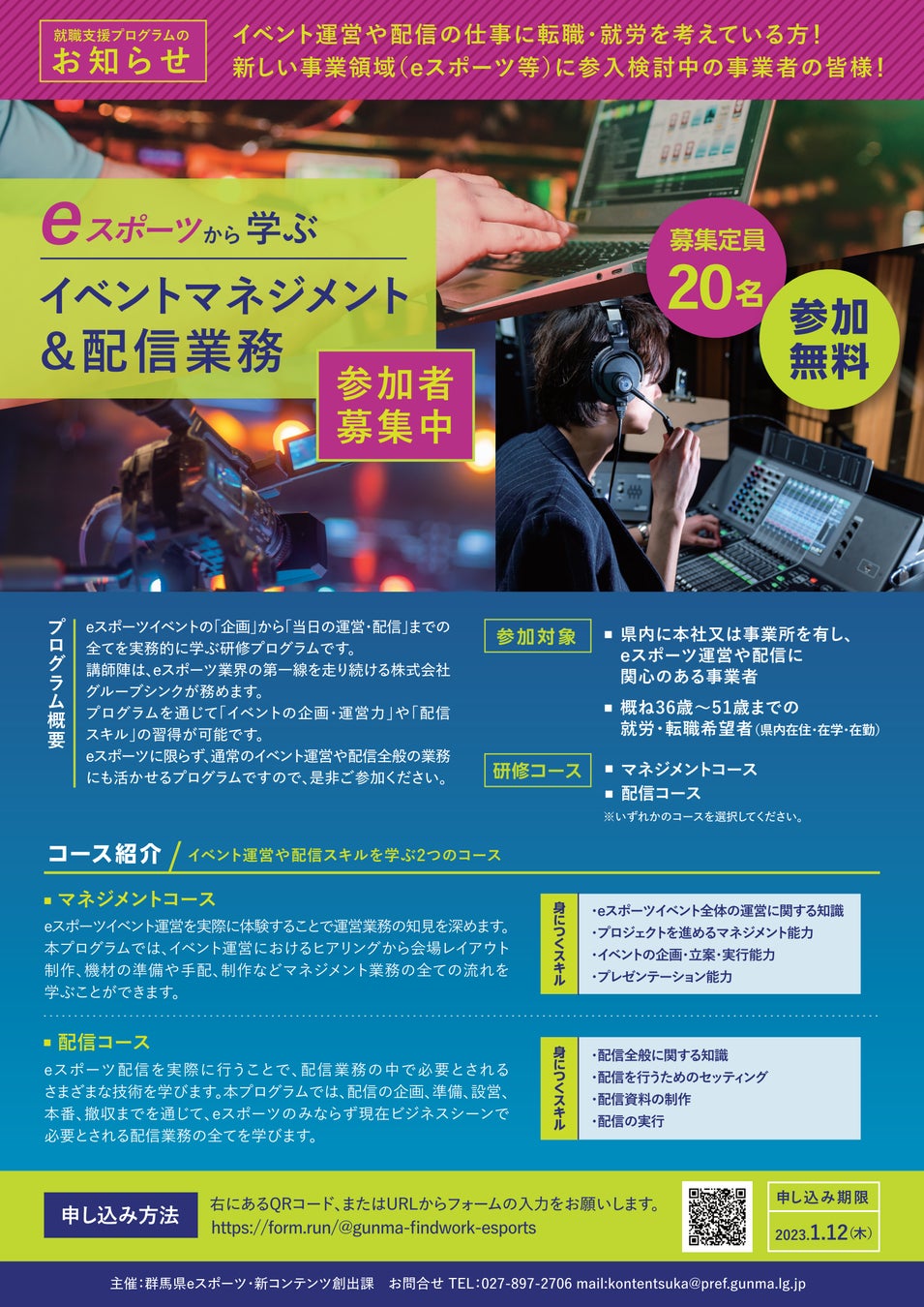 群馬県主催【就職支援プログラム】eスポーツから学ぶイベントマネジメント&配信業務」の参加者を募集中!