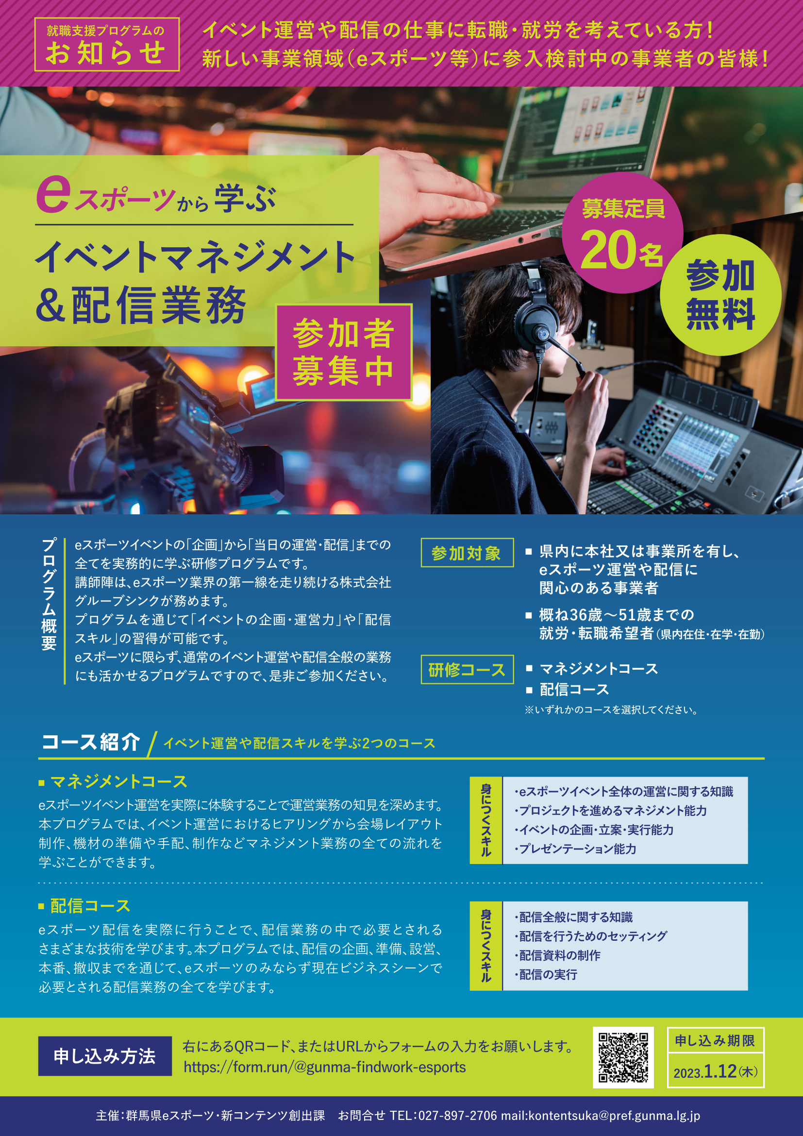 イベント運営や配信の仕事に転職・就労を考えている方、そして新しい事業(eスポーツ)に参入検討中の事業者の皆様、この機会に是非ご参加ください。