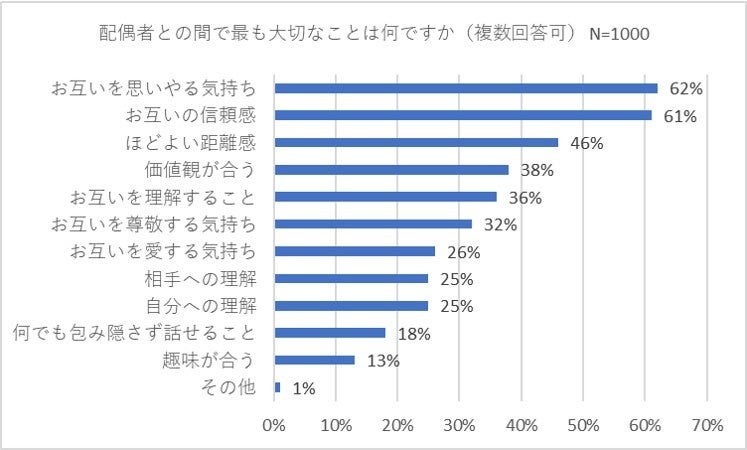 次に「配偶者との間で最も大切なことは何ですか」と複数回答可で質問したところ、「お互いを思いやる気持ち」(62パーセント)と「お互いの信頼感」(61パーセント)がほぼ同じ割合でトップ2となり、3位以下を大きく引き離しました。配偶者とは精神的な側面が最も重視されていることがわかりました。3位以下は「ほどよい距離感」(46パーセント)、「価値観が合う」(38パーセント)、「お互いを理解すること」(36パーセント)、「お互いを尊敬する気持ち」(32パーセント)が続きました。