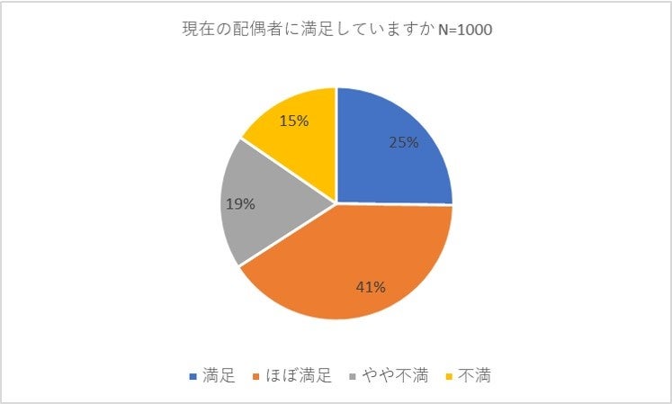 まず初めに「現在の配偶者に満足していますか」と質問したところ、「ほぼ満足」との回答が41パーセントでトップとなりました。以下、「満足」が25パーセント、「やや不満」が19パーセント、「不満」が15パーセントという結果になりました。「満足」と「ほぼ満足」の合計は66パーセントで「やや不満」と「不満」の合計34パーセントを倍近く上回りました。