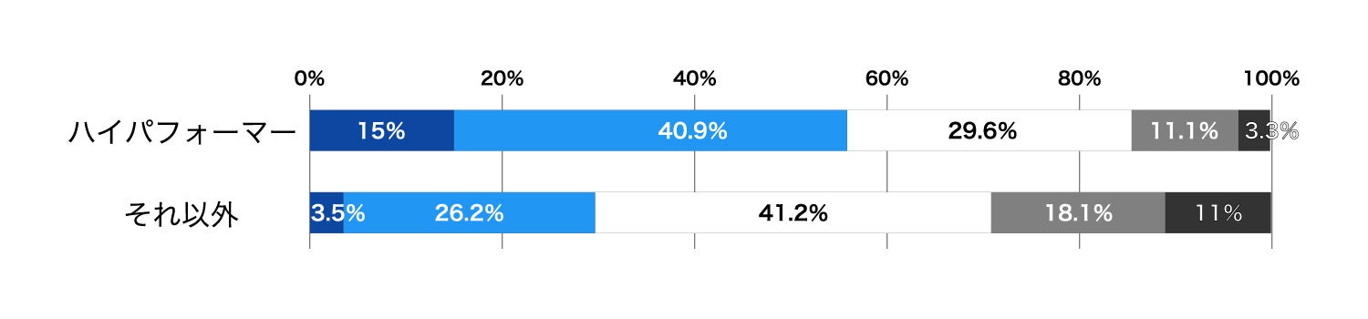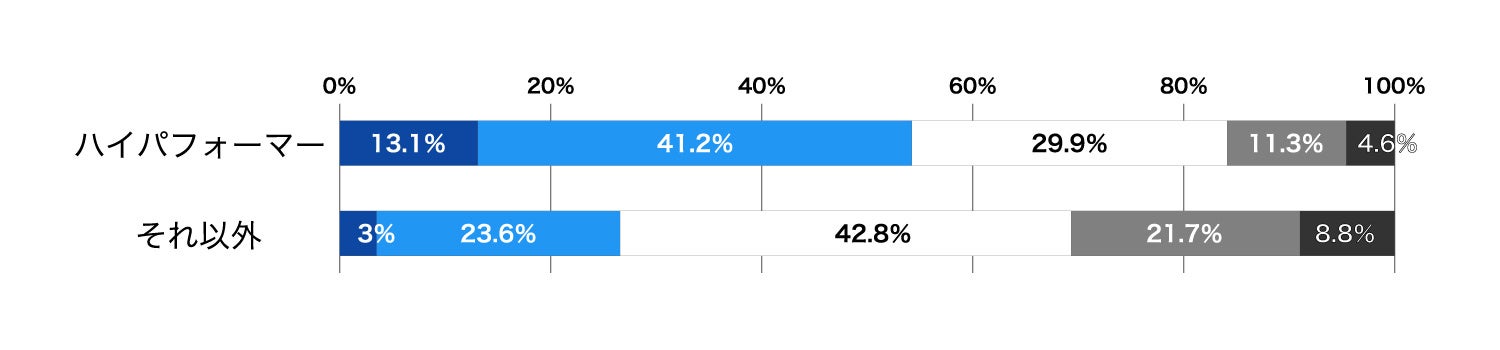 「あてはまる」「どちらかと言えばあてはまる」と回答したハイパフォーマーが55.9%、それ以外は29.7%
