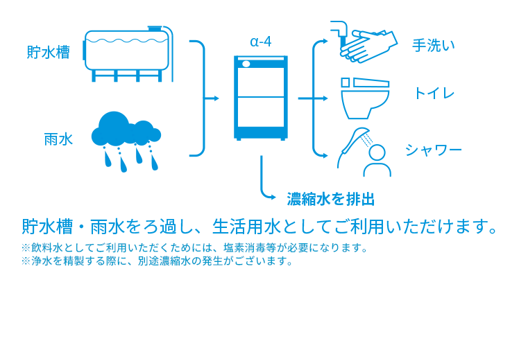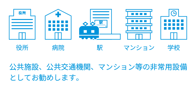 シンプルでコンパクトな「MYZ α-4」は施設内景観にも溶け込みやすいデザインのため、集合住宅、駅などの公共施設、病院の備蓄に最適です。災害時に人間が1日に必要な水は約3リットルといわれていますが、海水淡水化装置は1台で、川・海・プールなどから飲み水を含めた生活用水が造れるため、大量のペットボトルを蓄える事もなくなります。