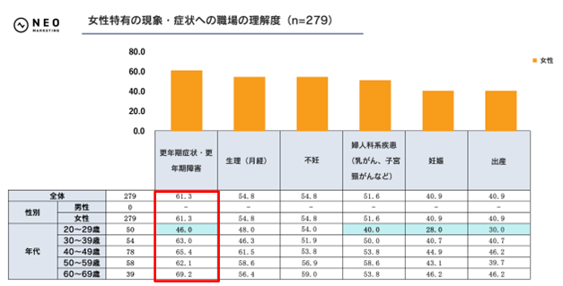 「更年期症状・更年期障害」が、最も職場で理解を得られていないと感じているようです。また年代別に比較すると、全体的に20代の割合が低くなりました。20〜29歳という年齢では経験しない現象や症状、ライフステージの違いがあることから、関心度合いに差が出た結果でしょう。