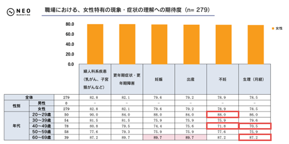 全体的に約80%〜90%の割合となっており、女性の有職者のほとんどが職場に対し各現象・症状への理解を求めていることがわかります。「不妊」「生理(月経)」については、女性の間でも年代ごとで差が大きく、前者は最大16.2ポイント、後者は最大16.7ポイントの差が生じていました。