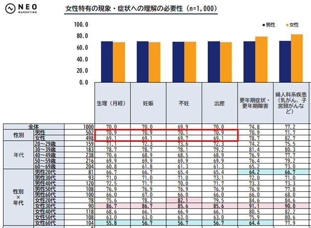 「女性特有の現象・症状に関する理解」では、男性の理解度が低い数値となっているものの、理解したいと思っている男性の割合が女性とほぼ同数いる点はポジティブであり注目すべき点です。
