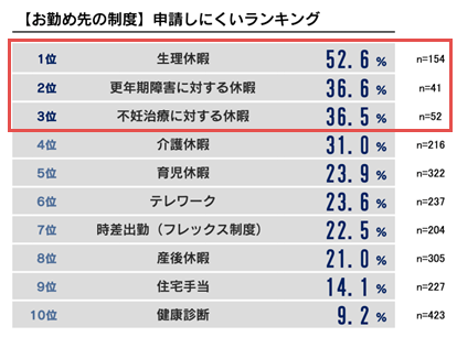 「あるかわからないランキング」のTOP3は「不妊治療に対する休暇」「更年期障害に対する休暇」「生理休暇」の3つ。「不妊治療に対する休暇」「更年期障害に対する休暇」の2つについては、女性であってもライフステージ等の違いから関心が薄いことも頷けますが、有職者の全女性が関係するであろう「生理休暇」がTOP3に入った点は驚くべきことではないでしょうか。