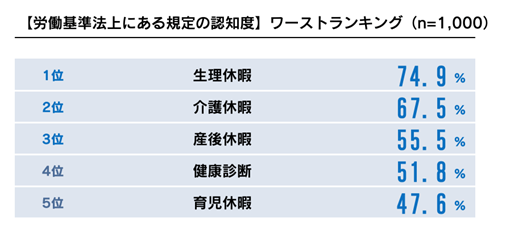 各休暇について、労働基準法で規定があることを知っているものをお聞きし、その結果をベースに「労働基準法上に規定があることを知らない(認知度が低い)」ランキングを作成しました。