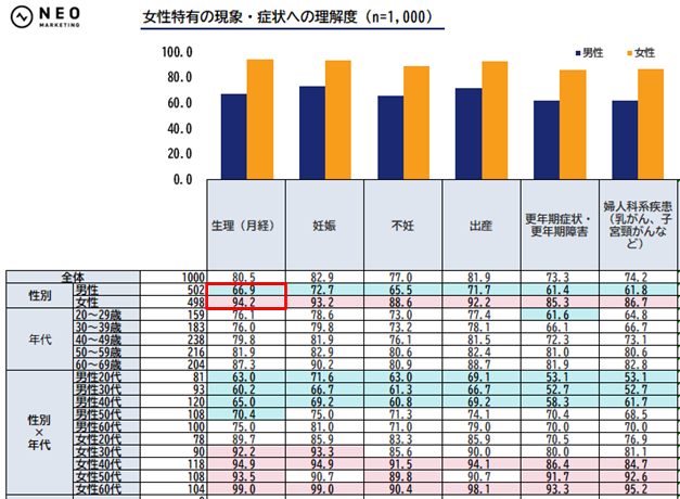 男女の割合を比較すると、全体的に20ポイント以上の差が生じていることがわかります。中でも最も理解度に差があったのが「生理(月経)」で、27.3ポイントでした。