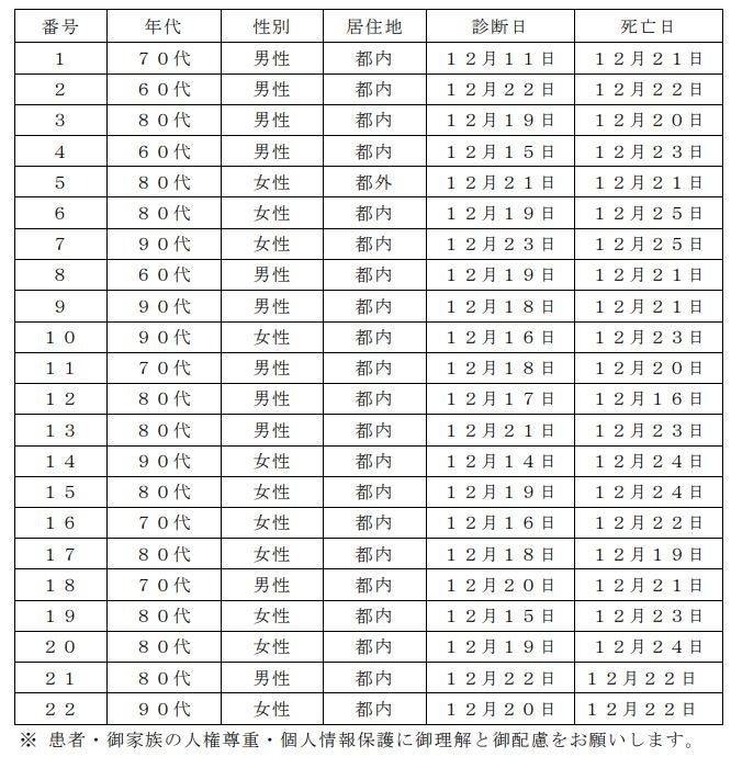 新型コロナウイルスに関連した患者の死亡について business Twitter Facebook はてブ Pocket LINE コピー 2022.12.26 この記事は約1分で読めます。 都内で新型コロナウイルスに感染した方が死亡されましたのでお知らせします。 お亡くなりになった方のご冥福をお祈り申し上げます。 1 新型コロナウイルスに関連した死亡者(本日公表分) 2 新型コロナウイルスに関連した死亡者の累計 6,664人