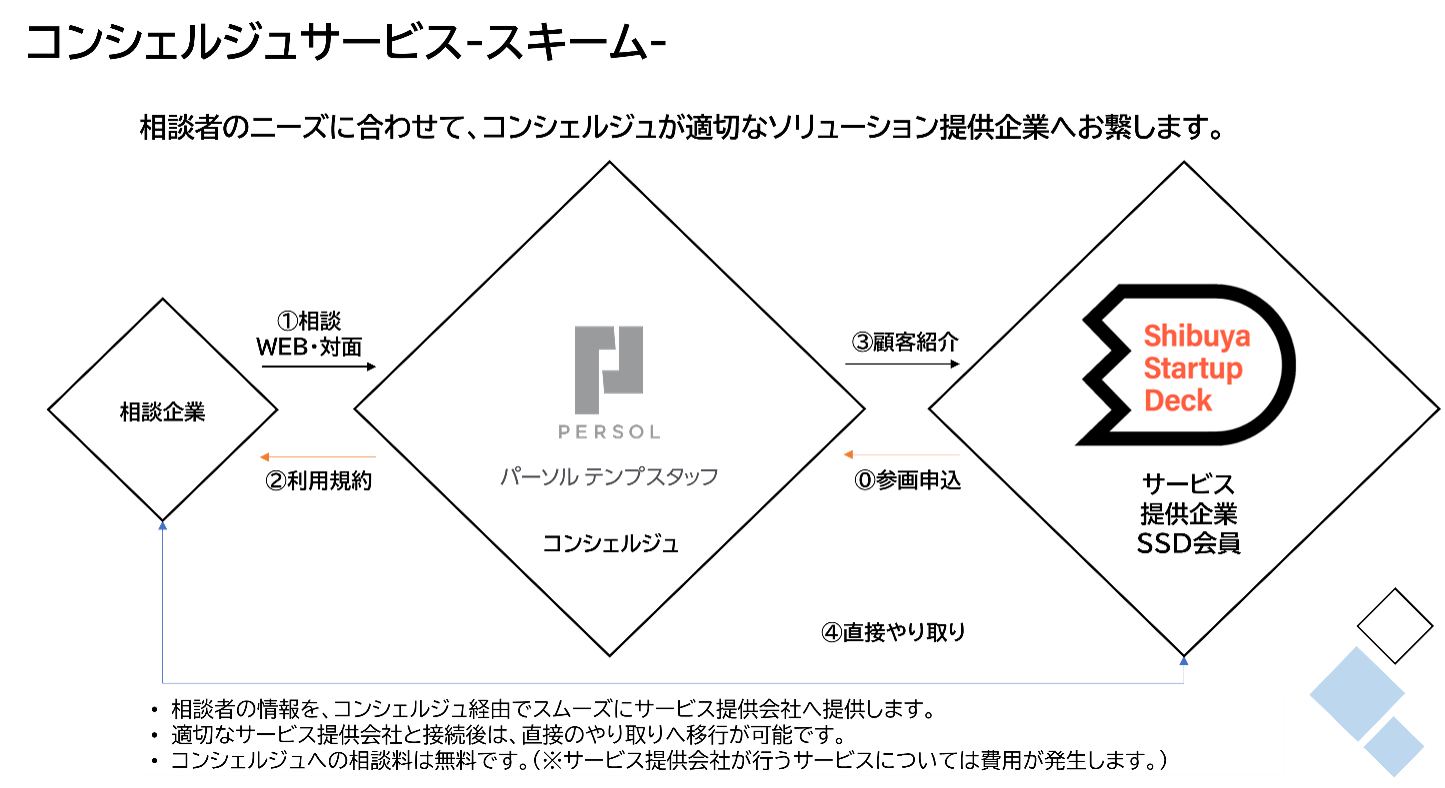 「ちがいを ちからに 変える街」渋谷から、起業を始める経営者の方も増えています。 成⻑過程の中で様々な課題があり、人にまつわる問題は少なくありません。 起業家の皆さんにおいては、「欲しい人材が見つからない」「求める人物の採用に適した採用チャネルがわからない」「労務管理が 適正に機能していない」そんなお悩みを抱えているスタートアップ企業様も多いのではないでしょうか? そんなスタートアップ企業の方々に対して、適切なソリューションへお繋ぎし、課題解決の一歩を後押しするべく、本サービスが立ち 上がりました。