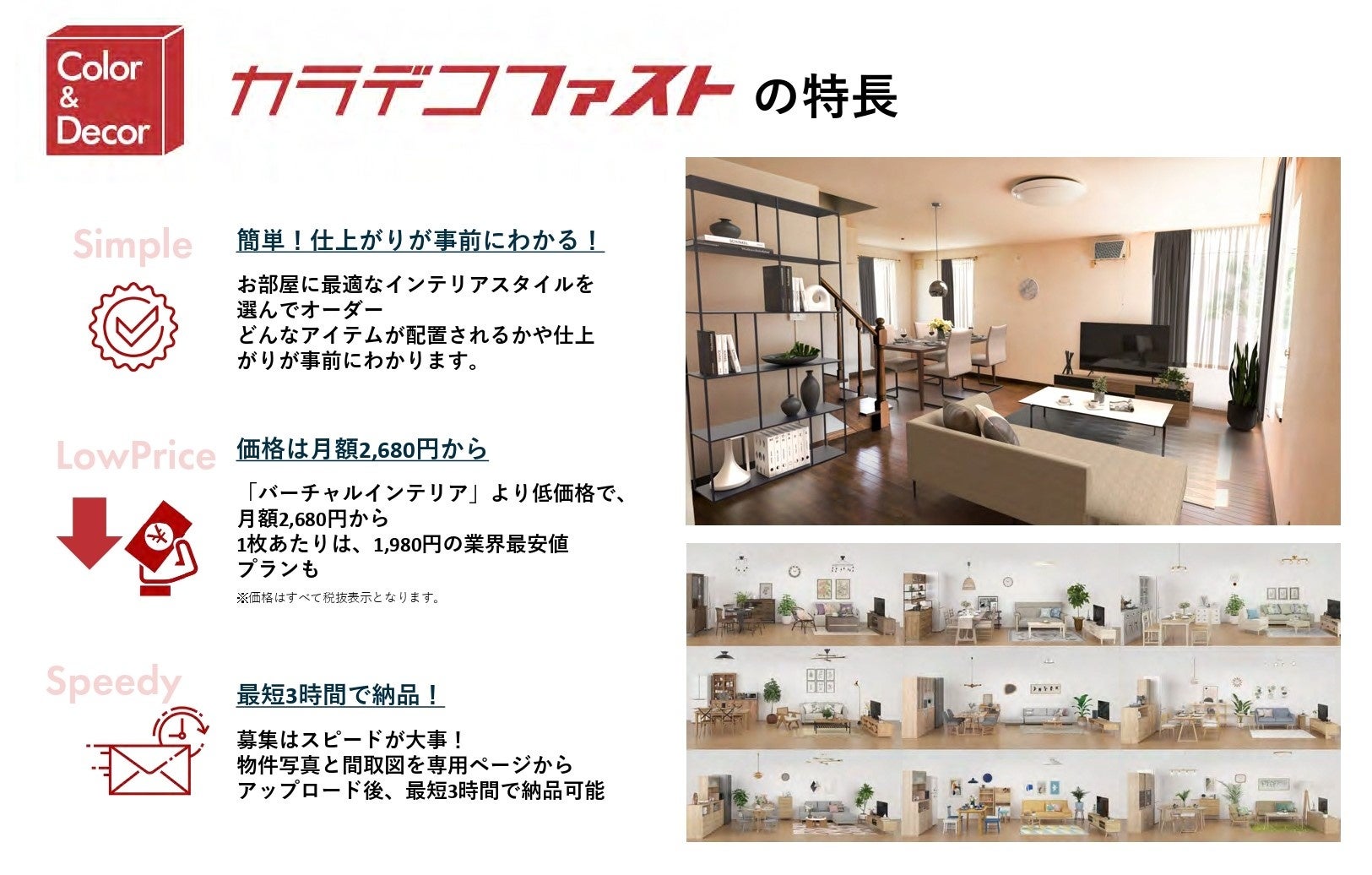 今年7月にリリースした、物件写真にインテリア3DCGをプラスした画像を、最短3時間~納品可能なバーチャルインテリア「カラデコファスト」は、おかげさまで不動産賃貸・売買仲介会社、オーナー様など1500社を超える企業の方にご愛顧いただいております。