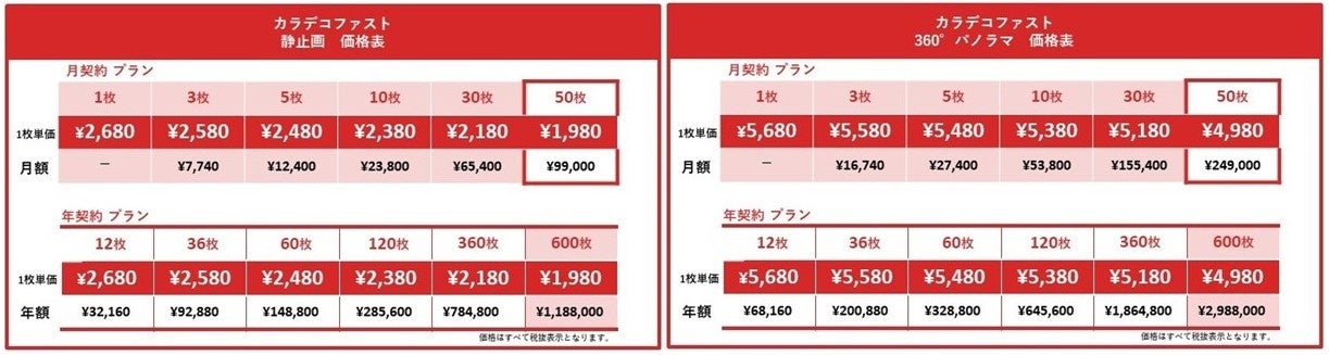 キャンペーン適用条件:カラデコファスト3年間のご契約に対して半年分無料とさせていただきます。 ※静止画写真・パノラマ写真全てのプランでご利用いただけます。