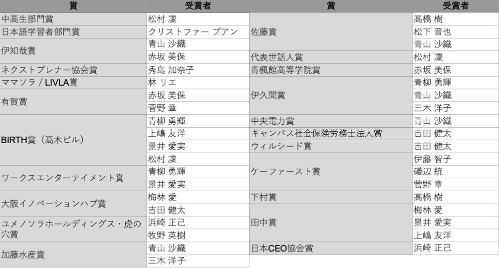 本オーディションでは、支援資金だけでなく、プロデューサーやアンバサダー、パートナー陣からは、「北海道の特産品プレゼント」「創業時の壁打ち支援」「会員制BARの飲み放題食べ放題」など合計22の個人賞と企業賞が発表されました。
