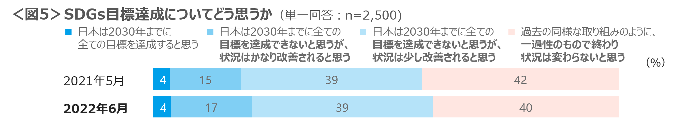 「SDGs」活動が進むことに対しての考えを聴取した結果は、「目標を達成はできないと思うが状況は少し改善されると思う」39%と「過去の同様な取り組みのように、一過性のもので終わる」40%が拮抗。昨年調査から大きな動きはない。<図5>