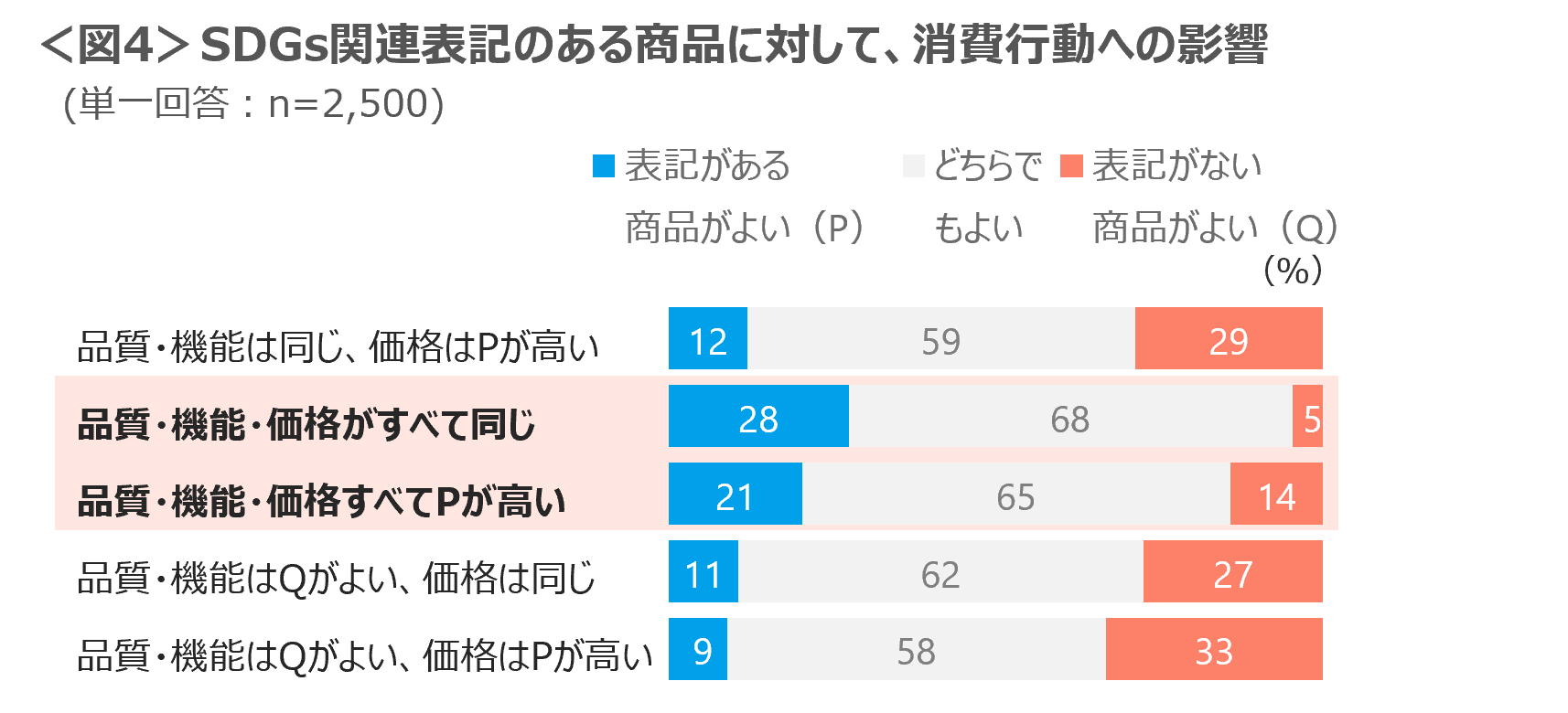 商品やサービスに、SDGs関連商品とわかる表記が”ある”場合と”ない”場合、どちらを購入するか聴いたところ、「品質・機能も価格も同じなら」「品質・機能も価格も高いなら」SDGs関連商品を購入するとした人は2割台。SDGs関連商品の表記よりも価格重視の傾向がみてとれる。<図4>