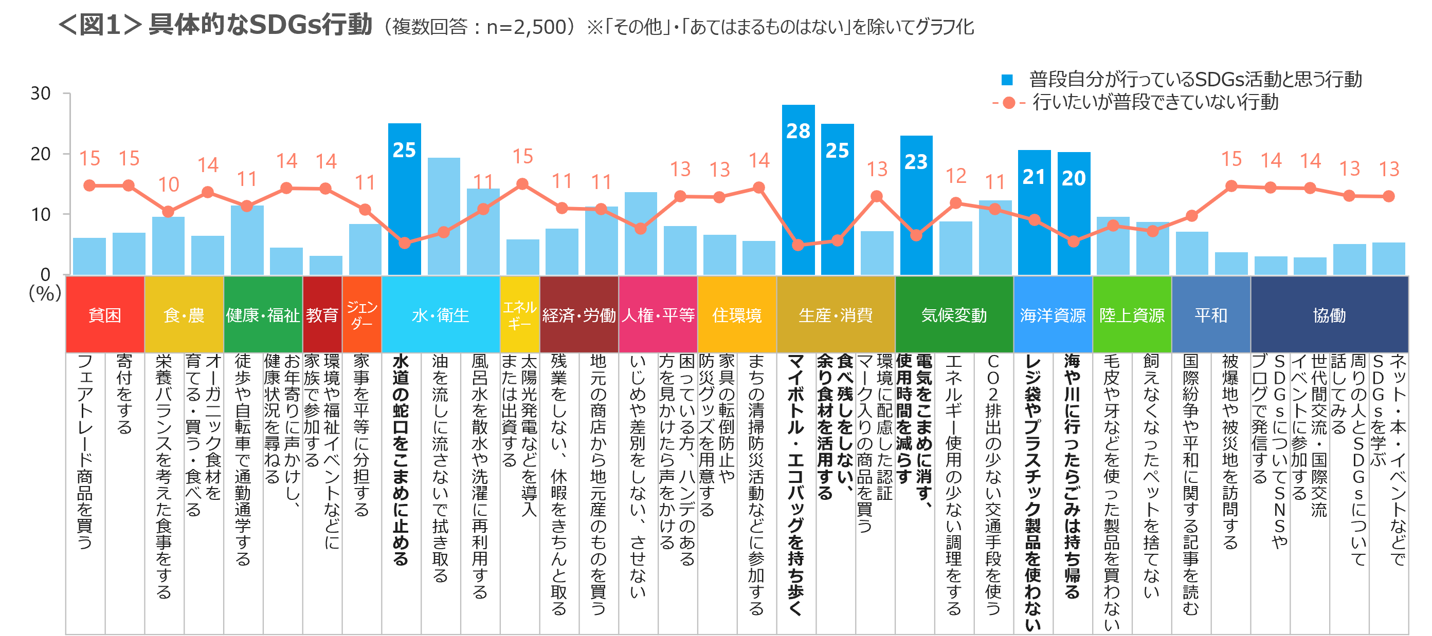 “普段行っている行動のうち、SDGsの活動と思うもの”は「マイボトル・エコバッグを持ち歩く」「水道の蛇口をこまめに止める」「食べ残しをしない、余り食材を活用する」「電気をこまめに消す、使用時間を減らす」「レジ袋やプラスチック製品を使わない」「海や川に行ったらごみは持ち帰る」と意識すれば行動できるものが上位である。一方、行動したいができていないことは、「太陽光発電などを導入または出資する」「寄付をする」「フェアトレード商品を買う」「被爆地や被災地を訪問する」などお金や時間のかかる活動ものがあがった。<図1>