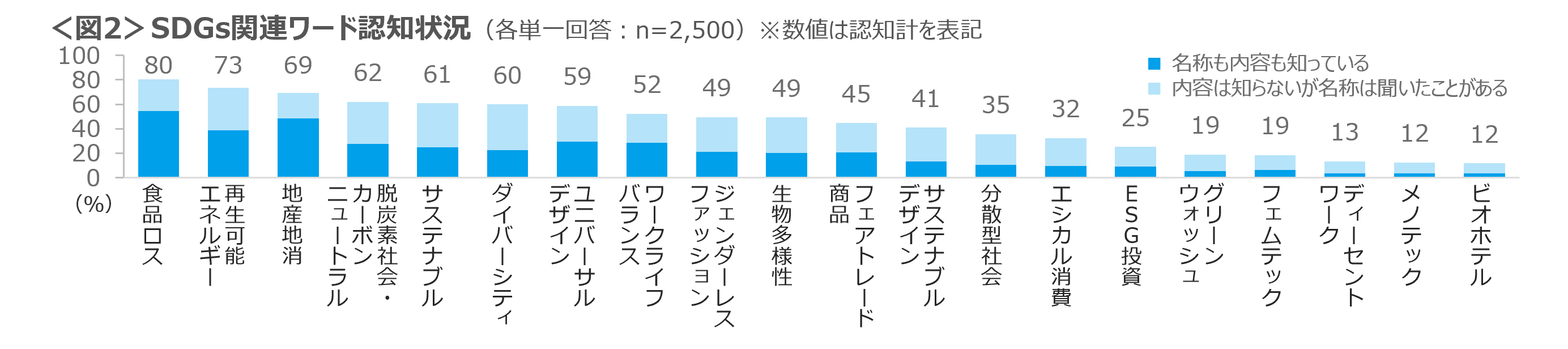 SDGsに関連するワードの認知率(”名称も内容も知っている”+”名称は聞いたことがある”)は、「食品ロス」「再生可能エネルギー」「地産地消」がTOP3である。<図2>