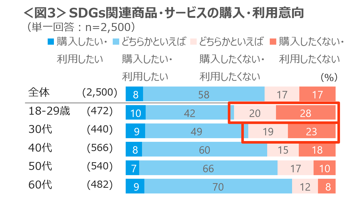 SDGs関連商品の購入や利用意向は、「購入・利用したい」が8%、「どちらかといえば購入・利用したい」は58%、合わせて66%である。18-29歳、30代は「購入・利用したくない」が目立つ。<図3>