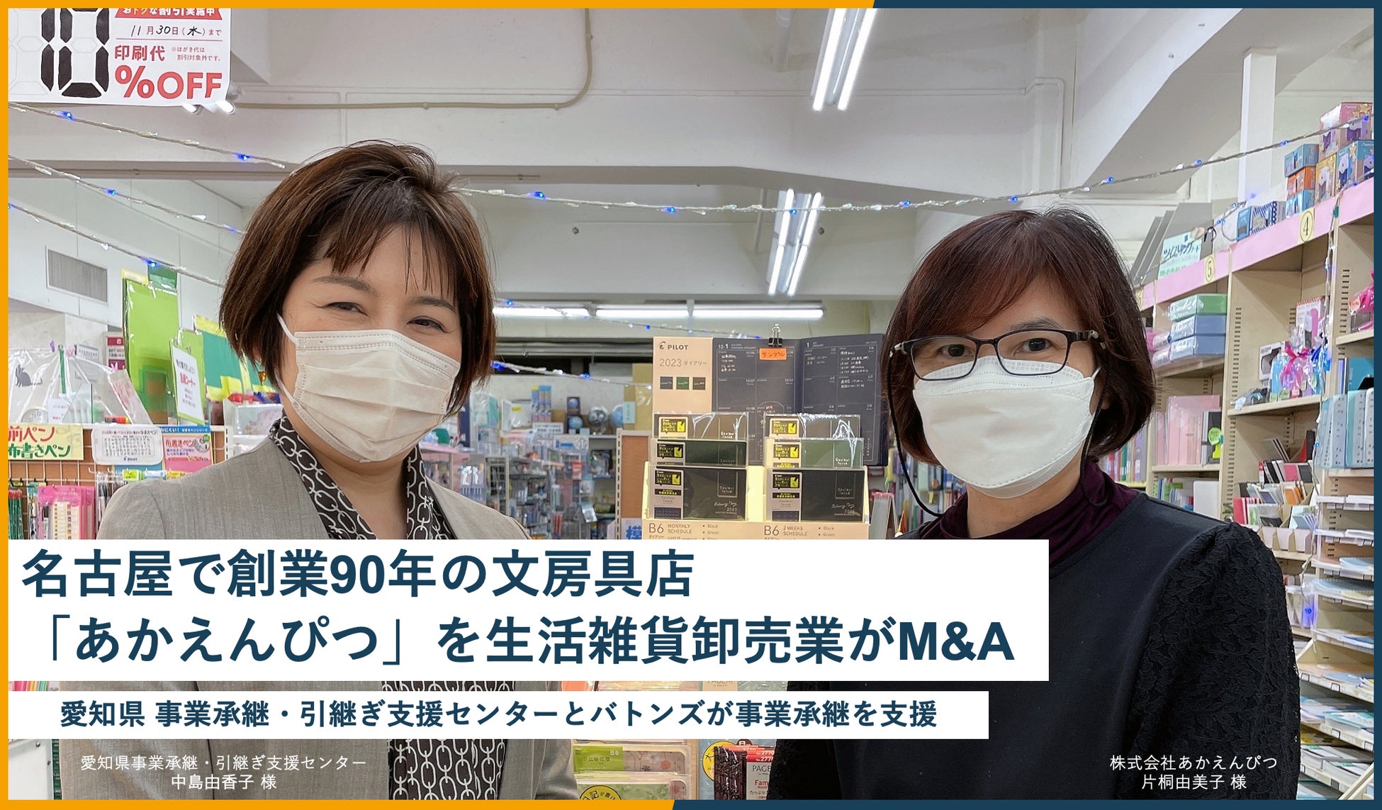 あかえんぴつは、愛知県名古屋市で創業から90年続く老舗文具店です。後継者が不在であったことをきっかけに愛知県事業承継・引継ぎ支援センター及びバトンズを活用して、岐阜県で生活雑貨卸売業を営む企業へ事業承継されました。