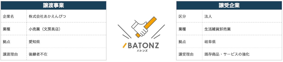 あかえんぴつは、愛知県名古屋市で創業から90年続く老舗文具店です。後継者が不在であったことをきっかけに愛知県事業承継・引継ぎ支援センター及びバトンズを活用して、岐阜県で生活雑貨卸売業を営む企業へ事業承継されました。