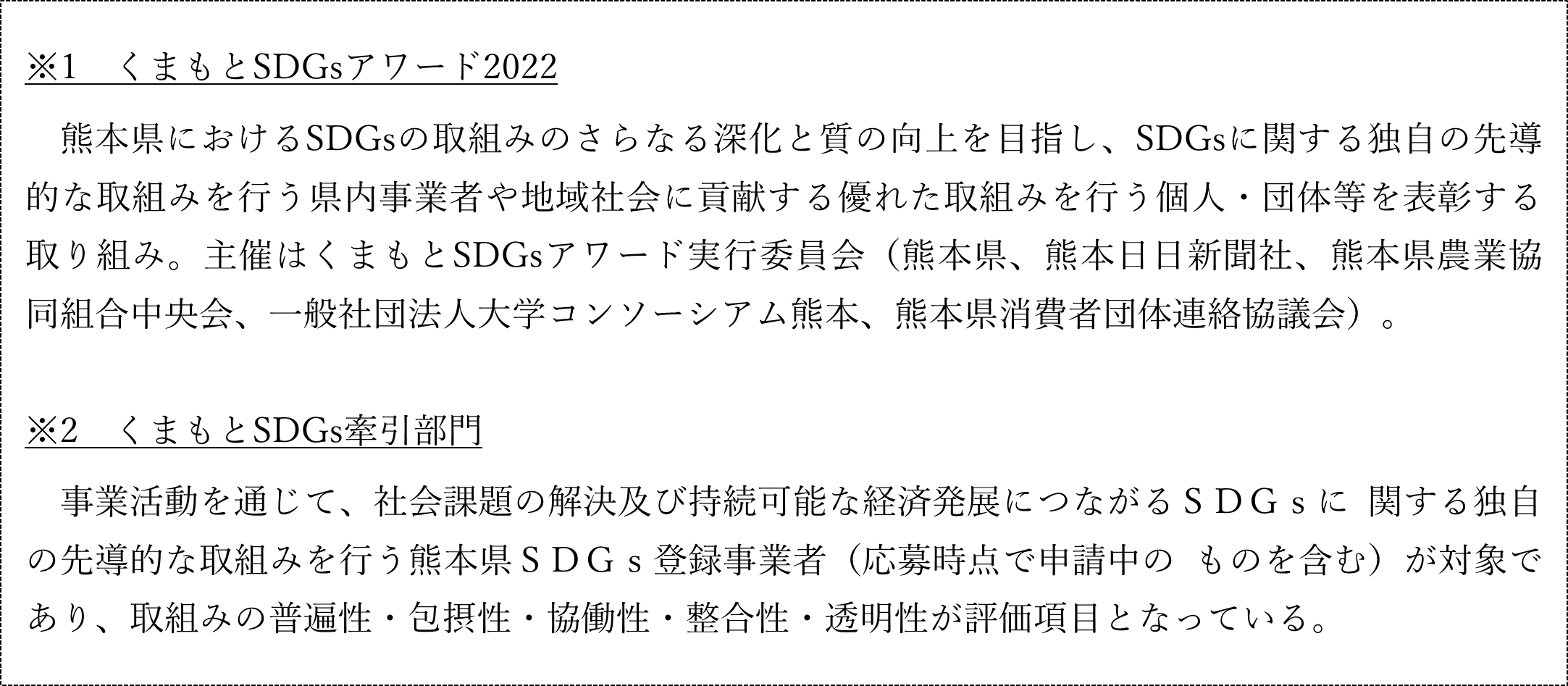 今回、くまもとSDGsアワード2022において、当社のSDGsに対する取組みについてご紹介させていただきました。その結果、「くまもとSDGs牽引部門:優秀賞」に選出していただき、2022年12月24日の熊本日日新聞本社での表彰式におきまして、くまもとSDGsアワード実行委員会様より表彰していただきました。
