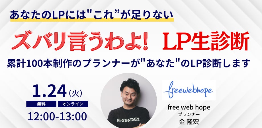 株式会社free web hope(本社:東京都千代田区、代表取締役:相原ゆうき)は、無料のオンラインセミナー「あなたのLPには”これ”が足りない ズバリ言うわよ!ランディングページ生診断〜累計100本制作のPlannerがあなたのLP診断します〜 」を1月24日(火)に開催いたします。(お申込みURL:https://share.hsforms.com/1ufyGwAjTQ6W1a8QkxsEnnw5fwo5 )